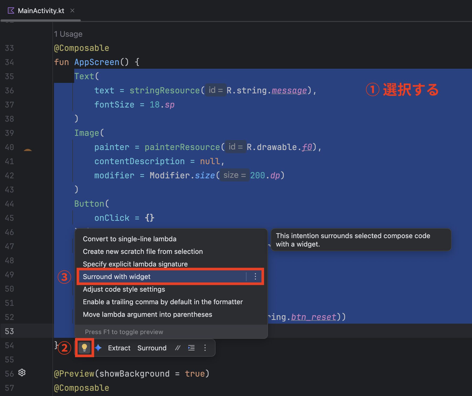 まずはアプリ画面のコンポーザブル関数を追加します。
