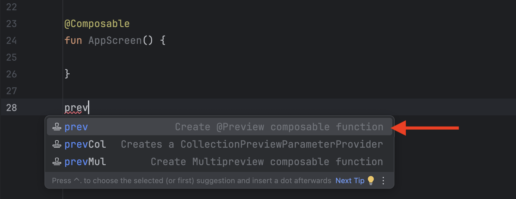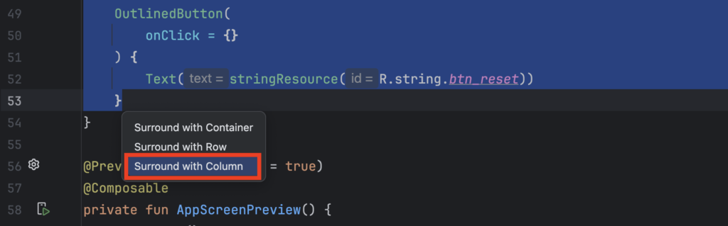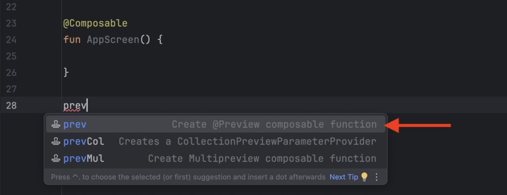 雛形が入力されたら、関数名に AppScreenPreview と入力します。プレビューが表示されるように AppScreen 関数を呼び出しておきましょう。