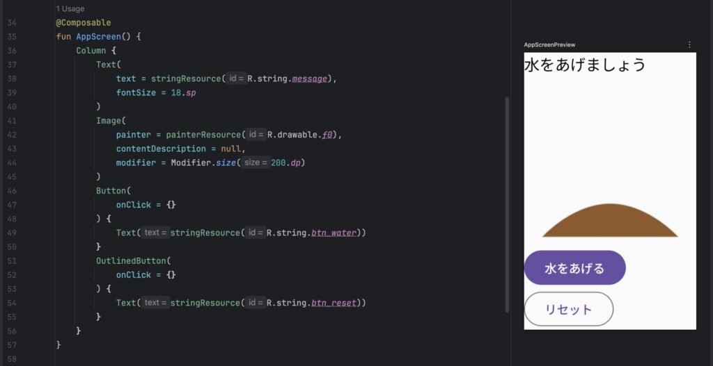 今回開発するアプリはとてもシンプルな見た目なので、この AppScreen コンポーザブル関数に全てのコードを書いていきます。