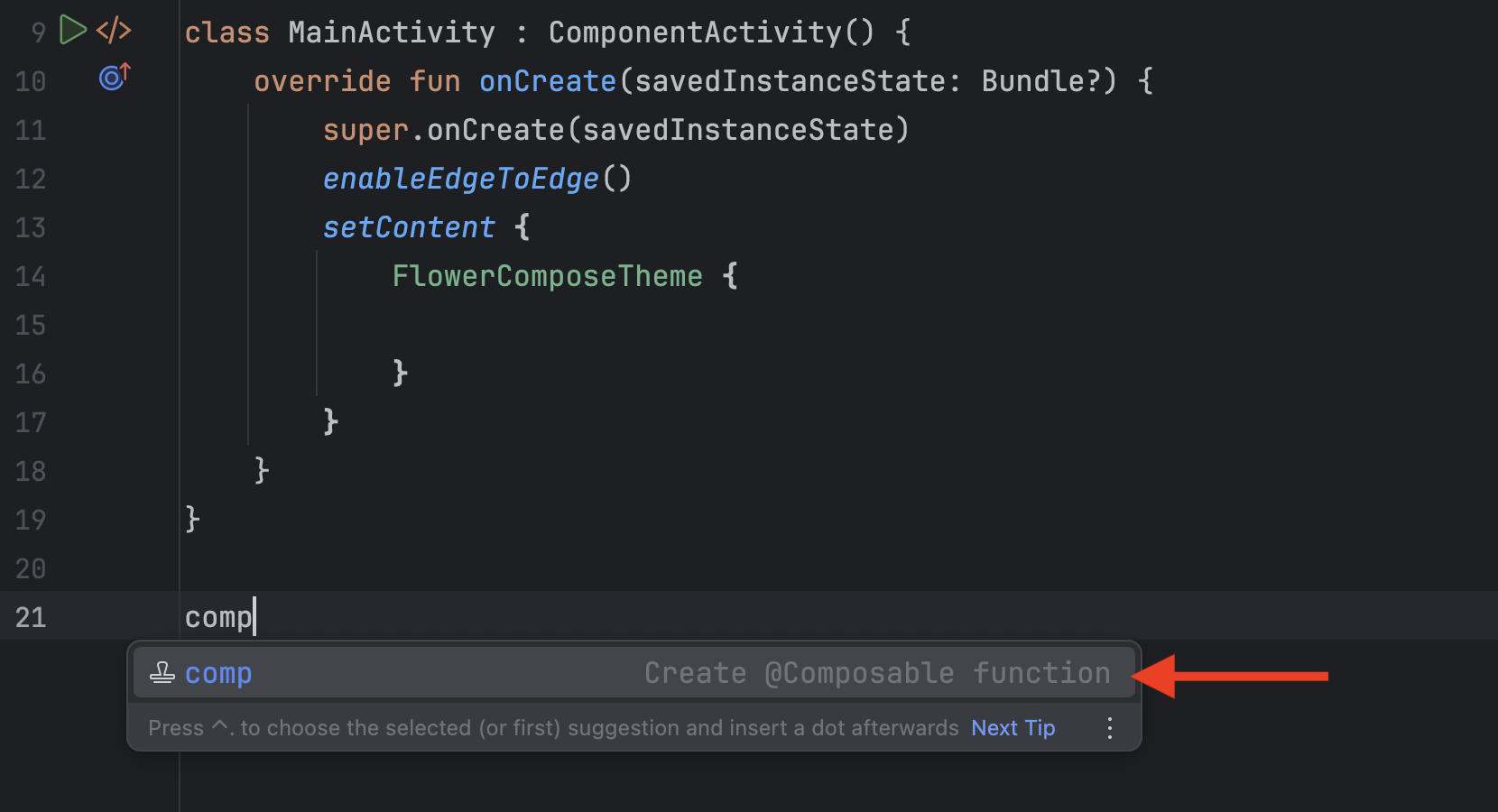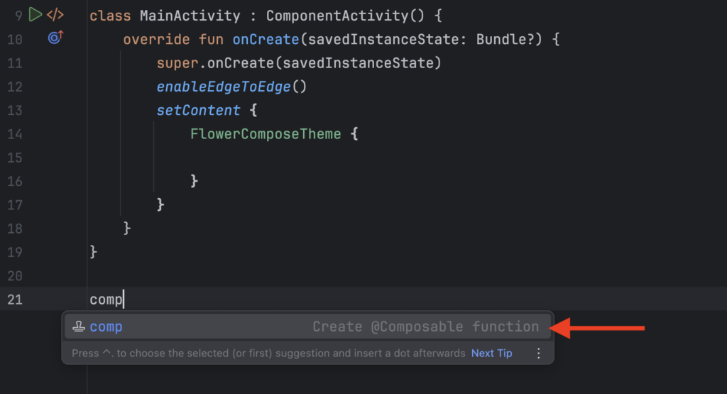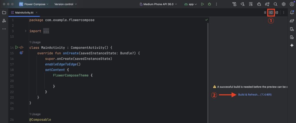 Jetpack Compose には activity_main.xml が存在しないので、MainActivity.kt にコードを書いていきます。