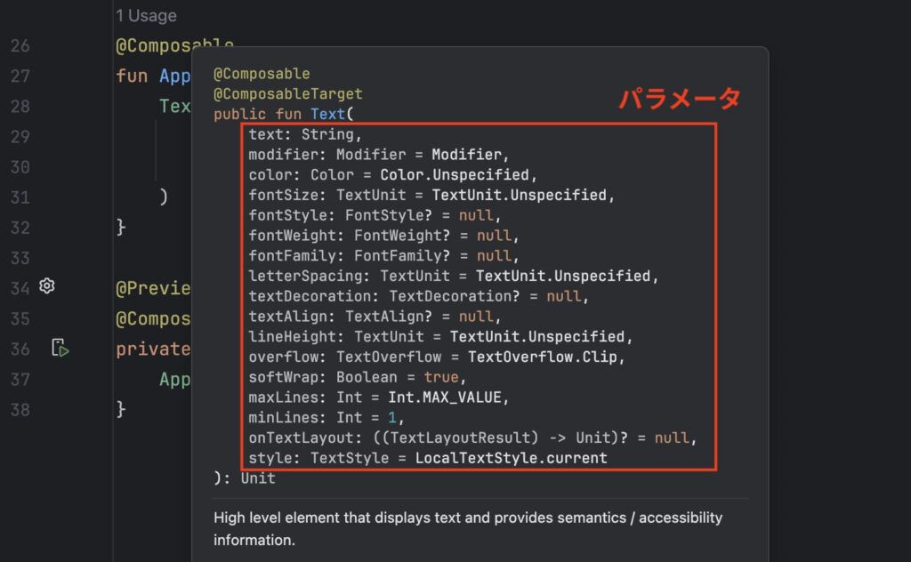 コードの Text 部分にカーソルを合わせると Text コンポーザブル関数の詳細が表示されるので確認してみましょう。